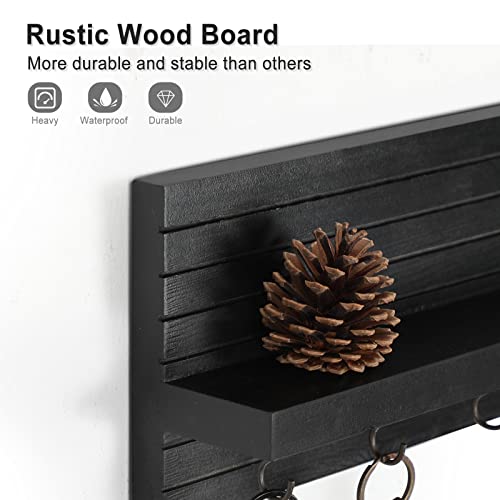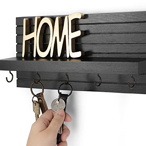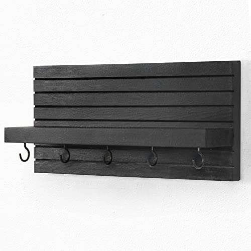 Decorative Key Holder for Wall with Shelf, Entryway Shelf with Hooks Holds Leashes, Jackets and Glasses – Sturdy Wood Keyholder Entrance Hanger with Mounting Hardware (11.8” x 5.5” x 3.1”) (Black)