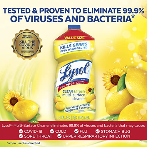 Help keep a healthier home top to bottom with Lysol Multi-Surface Cleaner. The Lysol Clean fresh Multi-Surface cleaner kills 99.9% of viruses and bacteria, and is approved to kill germs even when diluted ! (When used as directed). it cuts through tough grease and grime Provides long lasting freshness. This pourable cleaner can be used directly on stains for spot cleaning, or diluted in water for use on large surfaces like floors. Can be used on hard, non-porous surfaces In the kitchen, bathroom and other areas of the home.