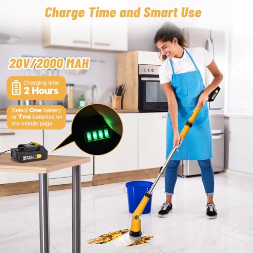 【Battery capacity and charging time】The cordless battery electric spin scrubber is equipped with a removable 20v high-power battery with a capacity of 2,000 mAh, which is fully charged in 1 hour and can work continuously for 2 hours (Mid speed mode). Enough for a deep cleaning job for your floor or bathroom. You can also purchase a dual-battery electric spin scrubber, One battery charges, and the other battery uses the electric tile scrubber. Cleaning will be very efficient
