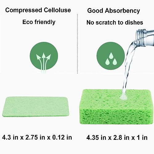 【NATURAL & Safe】: Made of natural sponge extracted from wood pulp, perfect kitchen sponges. No more bad smells for daily use, eco friendly and 100% biodegradable, good absorbency and no scratch to dishes.Tips: Absorb water and becomes soft to touch before use