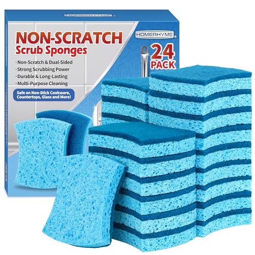 HOMERHYME Non-Scratch Cellulose Scrub Sponges 24 Pack, Kitchen Sponge with Double-Side & Ergonomic Design. Durable Sponge for Dishes, Coated Cookwares, Sink, Countertops.