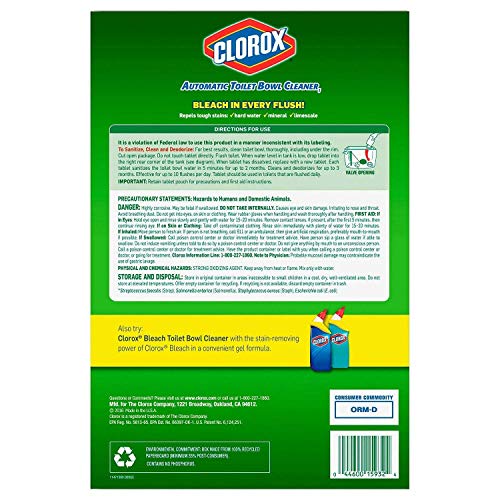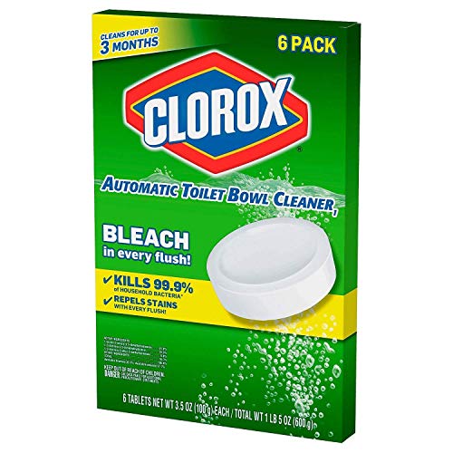 Clorox Automatic Toilet Bowl Cleaner tablet cleans and deodorizes with the power of bleach and kills 99.9% of household bacteria in the toilet bowl water. Each tablet sanitizes the toilet bowl water in 5 minutes, cleans for up to 3 months and helps prevent tough hard water, mineral and lime scale stains. These easy to us toilet tablets keep your toilet smelling fresh and sparkling clean with every flush, leaving bowl water crystal clear. To sanitize, cleand and deodorize, simply drop a tablet in the toilet tank and let it do its work. The tablet does not harm the septic tank. With Clorox, you know your toilet bowl is clean and disinfected.