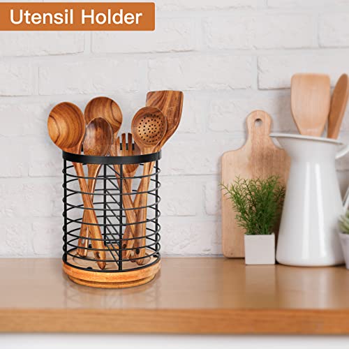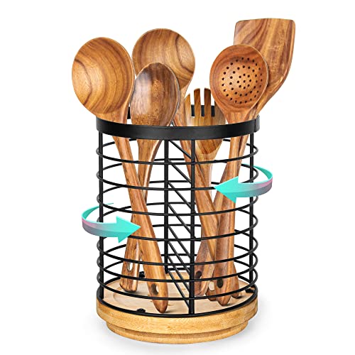 Specification: Toosci Utensil Holder for Kitchen Counter, Large Cooking Utensil Holder, Black Metal+Bamboo Base Utensil Holder, Breathable and Easy to Dry+Rotating+Drainage Hole, Kitchen Countertop Utensil Organizer