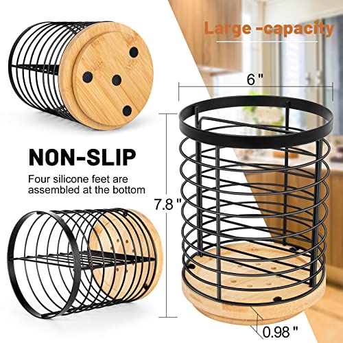 Toosci Utensil Holder for Kitchen Counter, Large Cooking Utensil Holder, Black Metal+Bamboo Base Utensil Holder, Breathable and Easy to Dry+Rotating+Drainage Hole, Kitchen Countertop Utensil Organizer