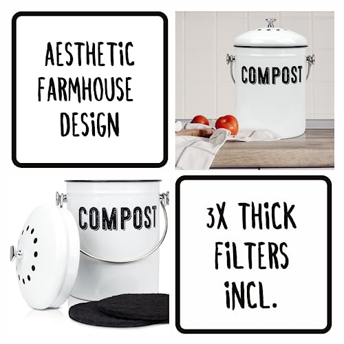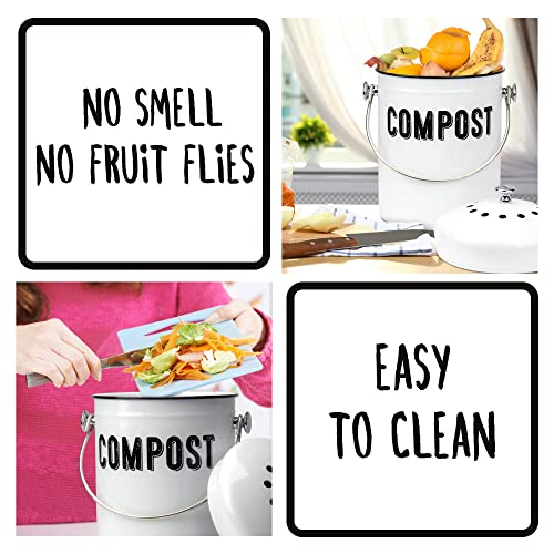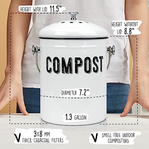 Granrosi Compost Bin Kitchen, Kitchen Compost Bin Countertop, Indoor Compost Bin, Countertop Compost Bin with Lid, 100% Rust Proof Compost Bucket w/ Non-Smell Charcoal Filters, 1.3 Gallon – White