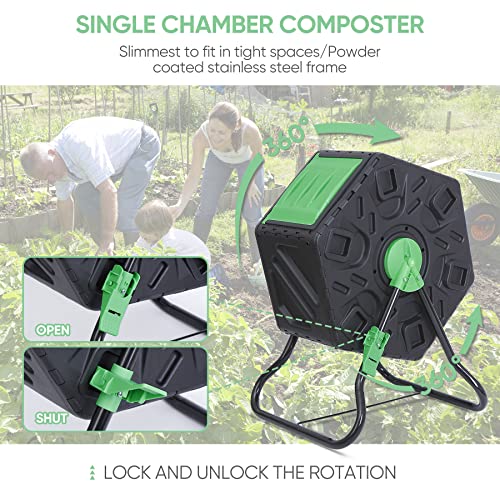 【Special Dual Chamber】 The compost tumbler bin has 2 separate chambers that allow you can use the compost more frequently and efficiently while a single barrel composter, you have to wait to add new materials until the original materials have properly decomposed. Also you can combine it with a dry source to avoid getting mushy compost