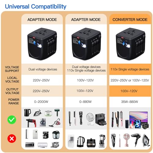 220 V TO 110 V CONVERTER — Power converter mode reduces the voltage from 220 / 240 V to 100 / 120 V at 120 V or step down to 120 V for electrical products from 26 – 880 W, with a maximum power of 2000 W at 240 V adapter mode.
