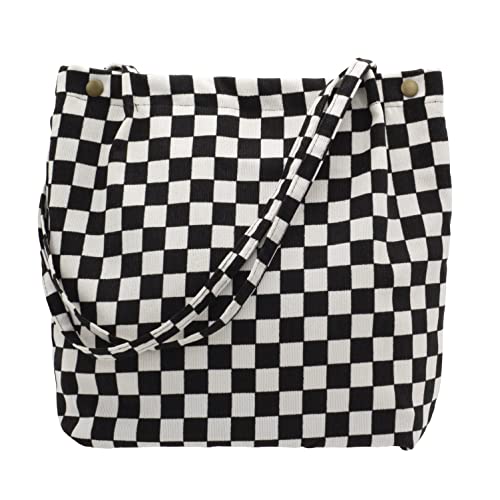PAZIMIIK Corduroy Tote Bags for Women Reusable Grocery Shopping Shoulder Go-to Everyday Bag with Canvas Lining for Work Travel School,Checkered Black