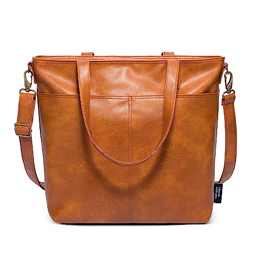 Simple Modern Vegan Leather Tote Bag for Women | Large Work Laptop Tote Bags with Zipper Top for Travel, School, Teacher | Shoulder Bag with Crossbody Strap and Pockets | 22″ Brown