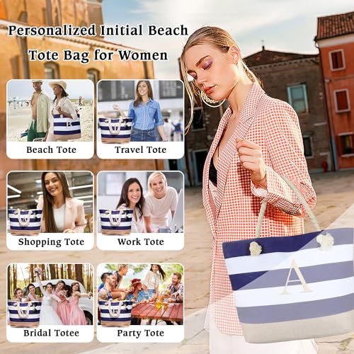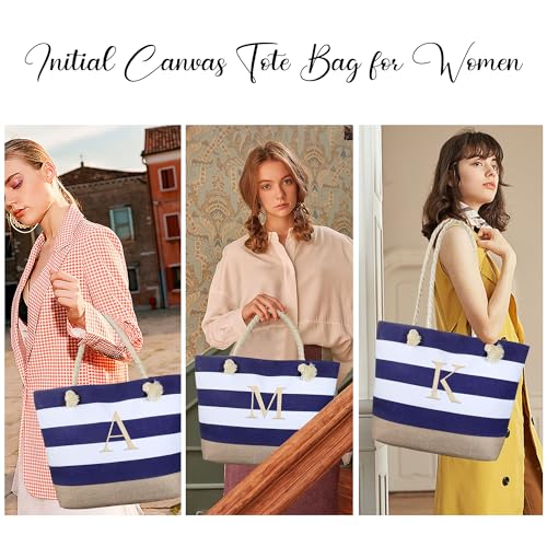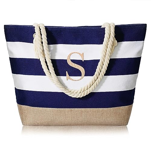 YOOLIFE Beach Bag for Women – Initial Canvas Tote Bag with Zipper Waterproof Bag Pool Bag Travel Essentials Personalized Gifts for Friends Female 30th 40th 50th 60th Birthday Gifts Idea S