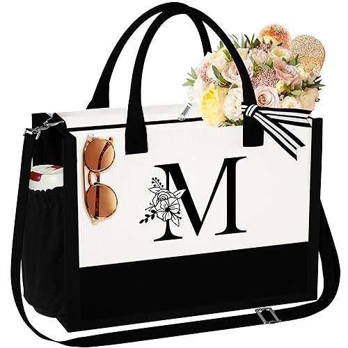 YOOLIFE Initial Beach Tote Bag, Canvas Letter M Tote Bag Birthday Gifts for Women Personalized Women Gifts Teacher Gifts for Women Mom Friend Bridesmaid Bride Gifts Wedding Gifts Bridal Shower Gifts