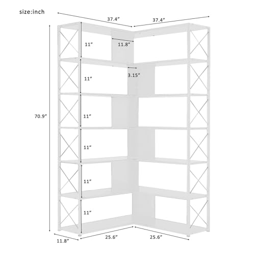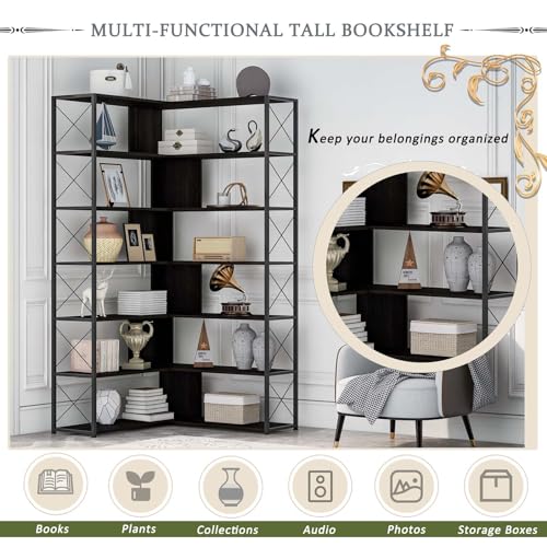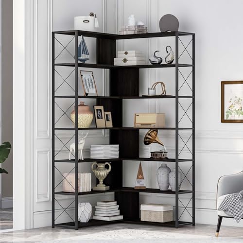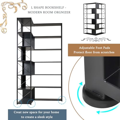Specification: 7-Tier Bookcase Home Office Bookshelf, L-Shaped Corner Bookcase with Metal Frame & Open Storage, MDF Board, Industrial Style Shelf for Living Room Bedroom Office (Black)