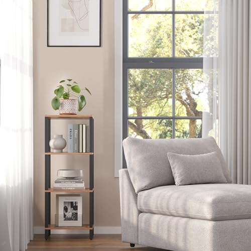 TUTOTAK Bookshelf, 4-Tier Small Book Shelf, Narrow Bookcase for Small Space, 10.7 x 15 x 40.8 Inches, for Living Room, Office, Study, Entryway, Industrial Style, Rustic Brown and Black BS01BB004