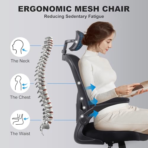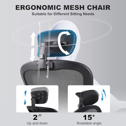 Flysky Ergonomic Office Chair- Mesh Home Office Chair with Lumbar Support & 3D Adjustable Headrests, Adjustable Height Executive Rolling Office Desk Chair with flip up arms