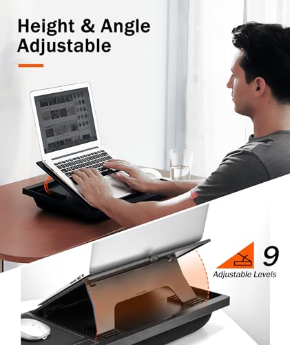 Adjustable Tilt Angles for Comfort: With 9 tilt angles, our laptop desk allows you to choose the most comfortable viewing or typing angle for your laptop or pad. Say goodbye to hunching over your device and neck pain. This adjustable feature provides a more ergonomic and pain-free work experience.