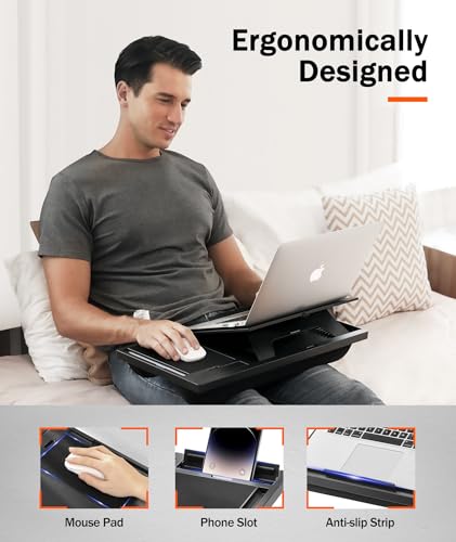 Convenient Mobile Workstation: Our bed and couch laptop desk serves as a versatile mobile workstation. It comes with a built-in mouse pad, phone holder and stylus pen slots, putting everything you need right at your fingertips. Whether you’re working from your bed, couch, chair, or even a park bench, this lap desk makes it easy to be productive from anywhere.