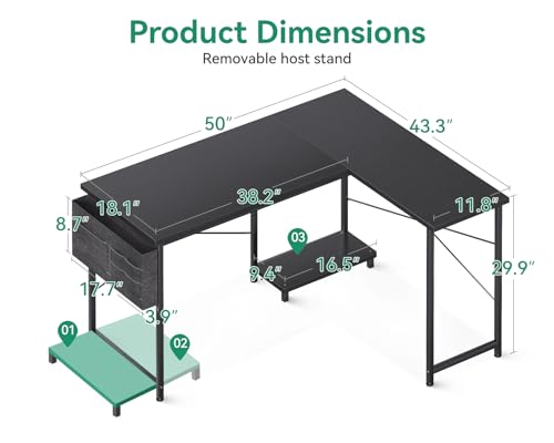 Specification: AODK L Shaped Desk, 50 Inch Computer Desk with Storage Bag, Reversible Home Office Desk with Host Stand, Black Corner Table for Bedroom Studio, Modern Wood PC Desk for Study Work