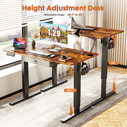 Electric Standing Desk with Drawer 48 x 24 Inches Stand up Desk with Storage Height Adjustable Desk Sit Stand Desk Black Frame/Brown Desktop Ergonomic Rising Desk Computer Workstation for Home Office
