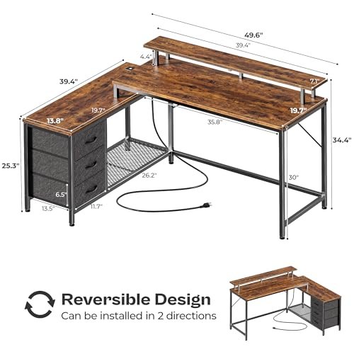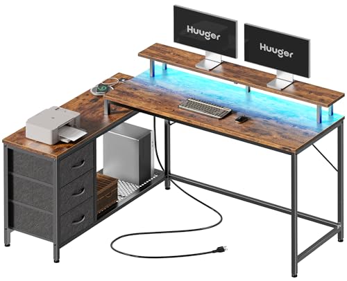 Specification: Huuger Reversible L Shaped Computer Desk with Drawers, Gaming Desk with LED Lights and Power Outlets, Office Desk with Storage, Corner Desk with Monitor Stand, for Home & Office, Rustic Brown