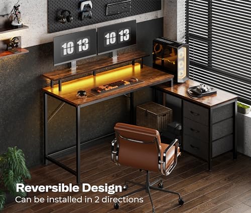 Huuger Reversible L Shaped Computer Desk with Drawers, Gaming Desk with LED Lights and Power Outlets, Office Desk with Storage, Corner Desk with Monitor Stand, for Home & Office, Rustic Brown