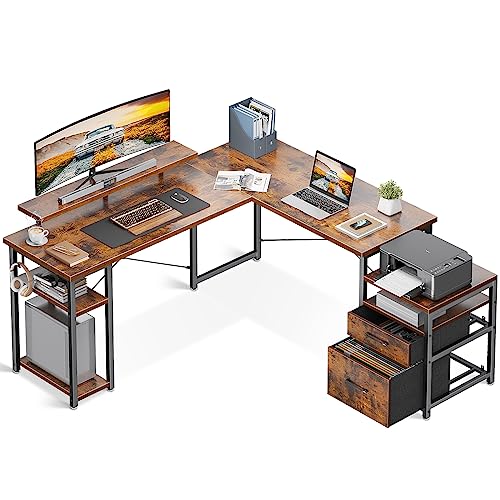 KKL L Shaped Desk with Drawers, 66″ Reversible Computer Desk with File Drawer, Corner Desk with Storage Shelves & Monitor Stand, Home Office Desk Workstation, Gaming Desk, Rustic Brown