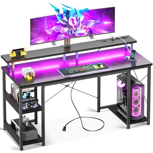 ODK 55 inch Gaming Desk with LED Lights & Power Outlets, Computer Desk with Monitor Stand & Storage Sheves, CPU Stand, Home Office Desk, Black