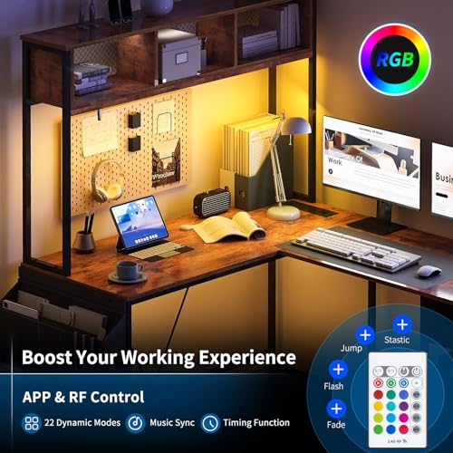 ✨【Gaming Table with Smart LED Light】Our L-shaped gaming desk with RGB LED lights creates more fun for gaming enthusiasts, which features over 60000 colors and 29 flashing modes via APP or remote control. Built-in music sync function can change the light color with the rhythm of sound and music, make your life chill. And with timer function, the LED lights will stay in the last mode when turned on. Choose your favorite color and mode, let the game begin!