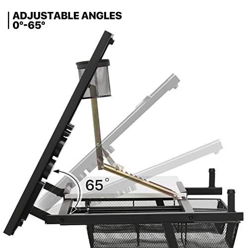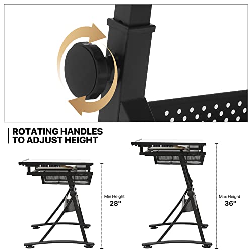 Height and Angle Adjustable – The height of this artist desk can be adjusted from 28 inches to 36 inches with the knob on the leg. Furthermore, the main tabletop angle can be adjusted from 0 to 65° to meet different creative needs. An adjustable pencil ledge on the bottom of the tabletop also helps hold papers and stationery when the desktop is tilted.