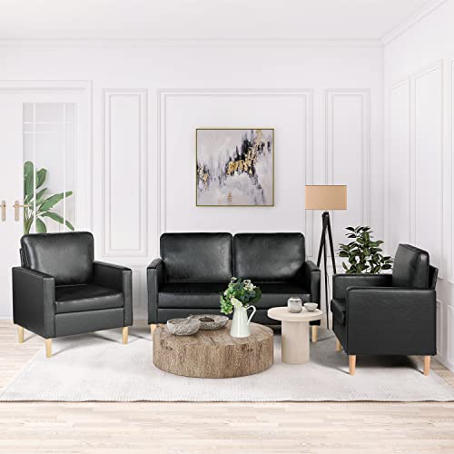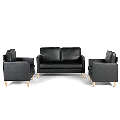 AILEEKISS Mid-Century Sectional Sofa Set Faux Leather Office 3 Pcs Couch Set with Armrest Modern Upholstered Loveseat Couches (1-Seater+1-Seater+2-Seater, Black)