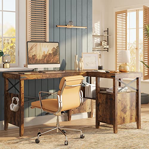 Bestier L-Shaped Home Office Computer Desk with Storage Cabinet & Bookshelf, Farmhouse Office Table for Writing Study, 60 x 42 Inch Corner Desk or 82.3 Inch 2 Person Long Desk, Rustic Brown
