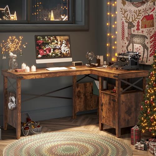 【Large Working Space】 The decent layout L-shaped home office computer desk offers adequate working space. Our Corner Desk with Shelves has a wide desktop that can hold many office supplies, such as monitors, table lamps, books, files, printers, laptops, etc. Large cabinet which can help you organize your workspace more efficient.