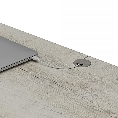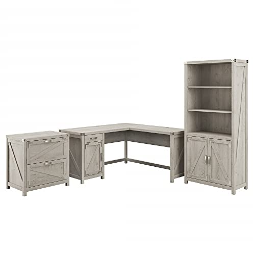 The kathy ireland® Home by Bush Furniture Cottage Grove 60W L Shaped Desk with Lateral File Cabinet and 5 Shelf Bookcase offers a personal workspace solution with appealing modern farmhouse style. Spread out on a work surface that extends 60 inches in each direction, supports up to 200 pounds and includes built-in wire management to keep cords and cables out of the way. Work materials and home office supplies can be stashed neatly inside the corner desk’s storage cabinet and drawer. Save space by placing the L Desk in a corner or make use of the finished back to take a prominent position facing out into the room. Use the lateral filing cabinet to organize letter, legal and A4-size paperwork. Matching height dimensions allow the L Shaped Computer Desk and 2 Drawer File Cabinet to be used side by side for an extended work surface. The Bookcase with Doors includes two fixed and three adjustable shelves, all of which support up to 50 pounds. Its combination of open and closed storage is perfect for organizing your personal library and household items while also brightening up the room with pictures and decorations. Cottage Grove’s rustic styling is highlighted by its sturdy and attractive post leg designs, diagonal wood accents, Weathered Nickel hardware and your choice of Reclaimed Pine, Cottage White or Restored Gray finishes. This home office furniture set has been tested to meet ANSI/SOHO standards for safety and performance and is backed by a 3 Year Manufacturer’s Warranty.