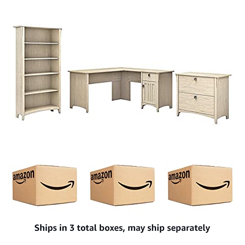 Bush Furniture Salinas L Shaped Desk with Lateral File Cabinet and 5 Shelf Bookcase, 60W, Antique White