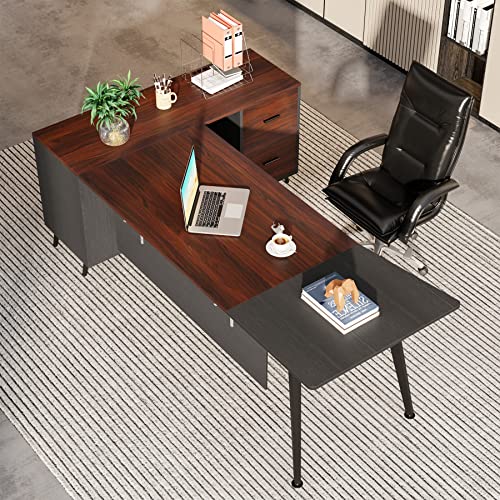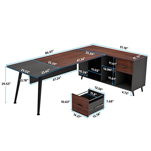 Specification: Tribesigns 87” Extra Large Executive Desk with 51” File Cabinet, L-Shaped Office Desk with Drawer and Storage Shelves, Home Office Computer Desk Workstation Business Furniture Set (Walnut)