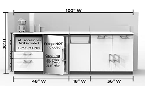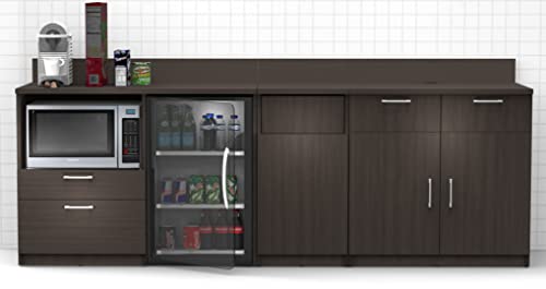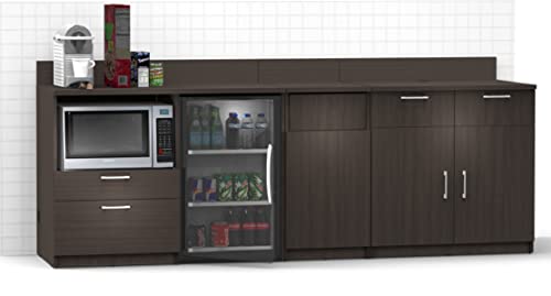 Coffee Kitchen Lunch Break Room Furniture Cabinets FULLY ASSEMBLED Ready To Use 3pc Group Model 3295 Color Espresso – INSTANTLY create your new Break Room!!! (Note: Purchase Includes Furniture ONLY). This group measures 72” W x 36” H x 24” D. Simplify the task of finding furniture cabinets for your Coffee Kitchen Lunch Break Room with this INSTANT SOLUTION (no wasted time searching in Big-Box stores or buying VERY EXPENSIVE custom-built cabinets … your business time is FAR TOO VALUABLE). Now you can use your new coffee kitchen lunch break room IMMEDIATELY. Colors emulate European clean transitional fashion trends for modern businesses … from start-ups to emerging companies to established giants … everyone needs a great Coffee Kitchen Lunch Break Room … it is as important a part of the modern office as a desk or a chair!! The complete group has all the essential elements for a very functional, practical and durable coffee kitchen lunch break room. Each piece is full commercial grade, with thermally-fused commercial melamine lamination for high use areas, EXTRA-thick tops, high impact edges to withstand bumps and dings, completely finished edges front, back and bottom for high usage, with solid back panels for perfectly square and rigid cabinets, and easy-to-install back splashes on prep stations and trash stations to increase functionality and limit liquid spills and food falling behind the cabinets. If a Fridge Cabinet is included in your group it will accept a standard small bar fridge measuring up to 20″W x 33″H x 20″D. If a Trash Cabinet is included in your group it ships with the plastic trash receptacle/s inside the cabinet. The hinges and hardware are European quality, with full extension ball bearing slides and high-end soft-close hinges. Your Coffee Kitchen Lunch Break Room is shipped on a secure pallet to your street address. Just open the cartons, remove the FULLY ASSEMBLED cabinets, put them in place… and ENJOY!