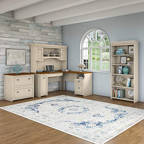 Bush Furniture Fairview L Shaped Desk with Hutch, Bookcase and Lateral File Cabinet in Antique White
