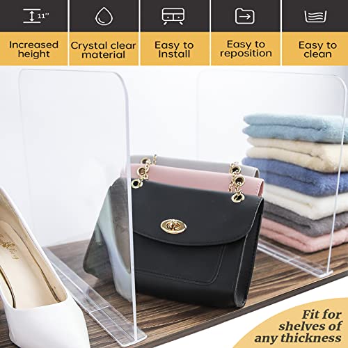 ❤【NEW DESIGN】- Measuring 11.8” deep x 11” tall, our transparent acrylic shelf dividers are taller than most of other closet dividers offered. Clipless design makes the dividers suitable for shelves of any thickness. Just stick the shelf organizer to the place you want using the nano tape came with it. No sliding or flexing is needed during fixing. No worry about it breaking.